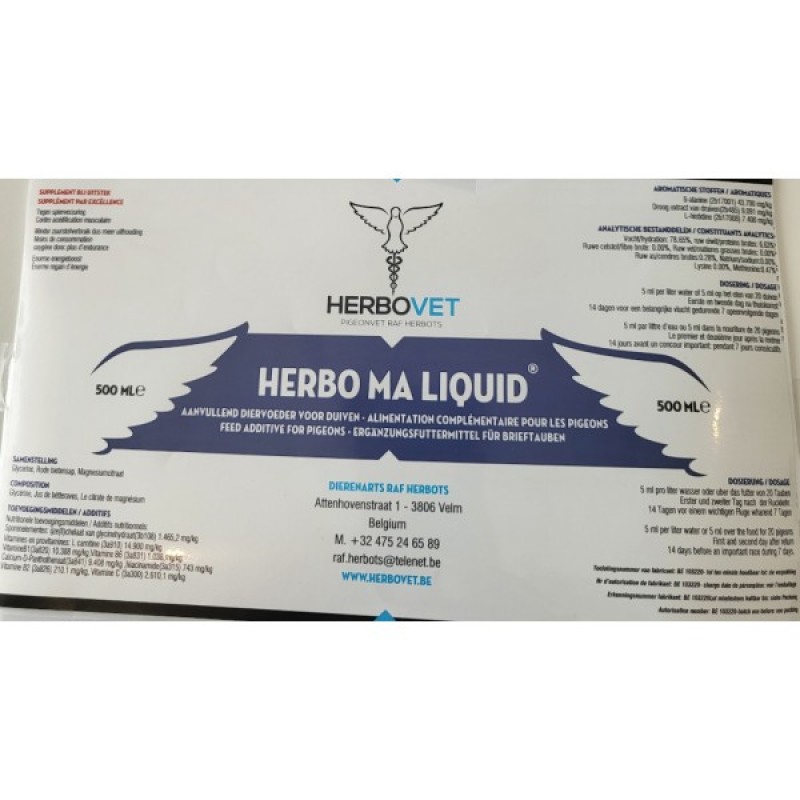 De Herbovet spierverzuring is het supplement bij uitstek om spierverzuring bij duiven tegen te gaan. Er wordt in dit supplement onder andere gewerkt met rode bietensap. Deze is rijk aan vitaminen (A, B1, B2 en C) en mineralen (calcium, natrium, magnesium, ijzer, foliumzuur en fosfor). De werking is vooral toe te wijzen aan het nitraatgehalte die in hoge hoeveelheden aanwezig is in rode bietensap. Nitraat zorgt er voor dat het zuurstofverbruik bij inspanningen wordt verlaagd, waardoor sportduiven uiteraard hun inspanningen veel langer kunnen volhouden. Er is aan dit supplement ook de zuivere glycerol toegevoegd. Eerst en vooral omdat dit een enorme energiebooster is en daarnaast ook omdat dit enorm de smakelijkheid bevordert. Twee gekende aminozuren om verzuring tegen te gaan zijn beta-alanine en carnitine, deze zijn in dit supplement dan ook aanwezig. Er is ook extra histidine toegevoegd, omdat histidine en beta-alanine verantwoordelijk zijn voor de opbouw van carnosine. Carnosine heeft de eigenschap om verzuring te kunnen bufferen. Magnesiumcitraat zorgt dan terug voor de soepelheid in de spieren. Om al de afvalstoffen uit het lichaam te kunnen verwijderen is in dit supplement ook gewerkt met een heel krachtig natuurlijk anti-oxidant. Daarnaast bevat het ook vitamine C als anti-oxidant. Tot slot is ook het volledige vitamine B-complex aanwezig in dit mengsel om de energieproductie te voorzien.